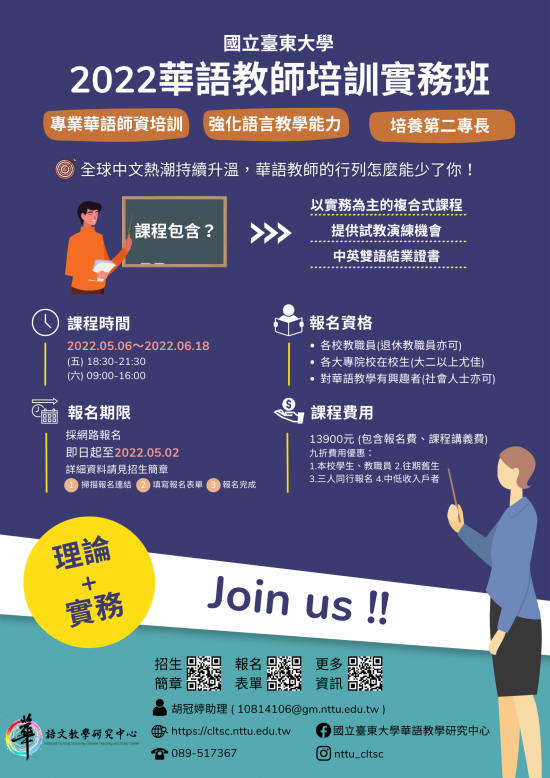 | 主旨: | 本校華語文教學研究中心開設「2022華語教師培訓實務班」培訓課程,請協助宣傳並鼓勵所屬參與課程,請查照。 |