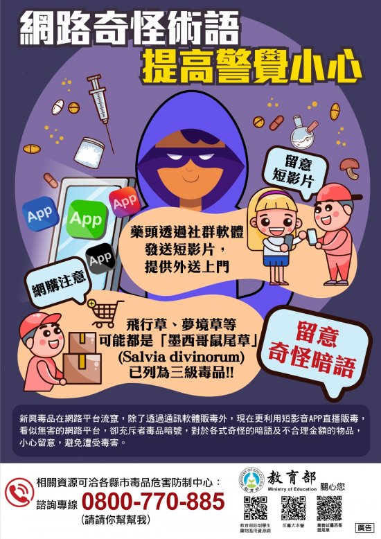 | (一) | 「破解網路涉毒危機」實體及電子海報及「網路奇怪術語 提高警覺小心」電子海報: |