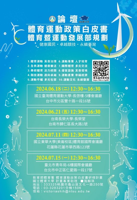 | 四、 | 活動聯絡人:國立體育大學施靜琪助理(電話:03-3283201分機1506,E-mail: victoriashih @ntsu.edu.tw)。 |